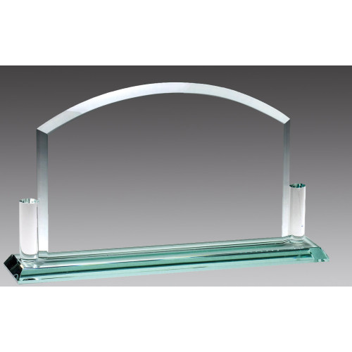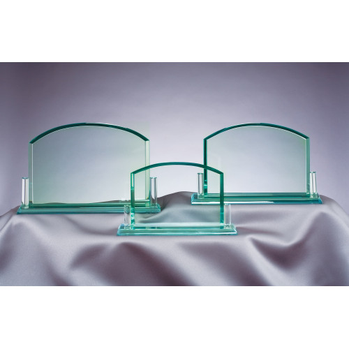 3/8" thick jade glass award Billboard award features a graceful arch with two glass accents, mounted onto a jade glass base.