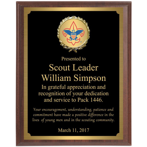 Brown wood-grain finish economy wall plaque with black brass engraved plate, coordinating border, and medallion holder with red and blued Boy Scouts of America insert.