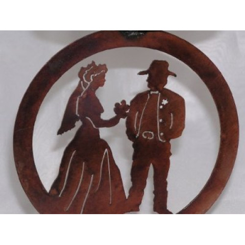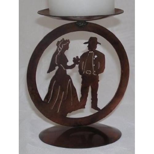 This medallion candle stand features a cowboy groom gazing at his lovely bride