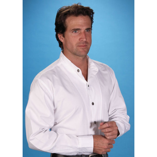 It features a western back yoke, a button front with a removable concho button strip and cuff stubs on French cuffs.