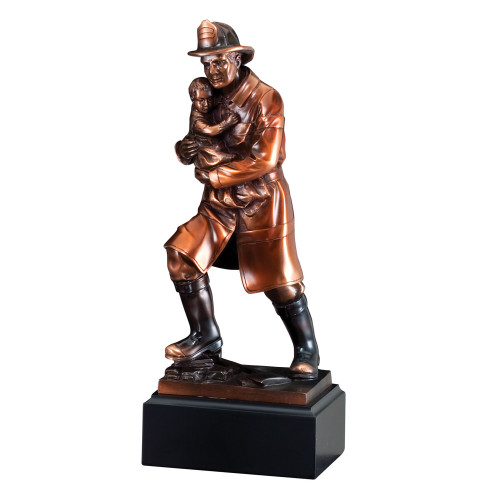 Resin firefighter statue featuring a fireman saving a child from a fire. This is a perfect award for the heroic firefighter in your life. 12” tall.