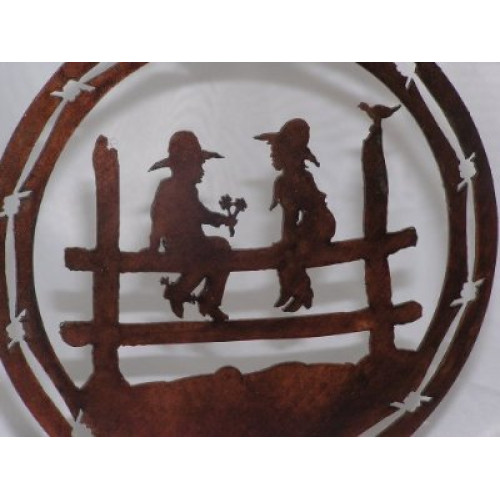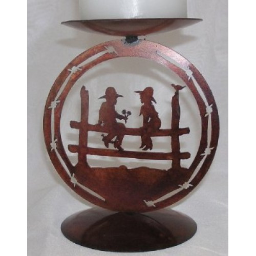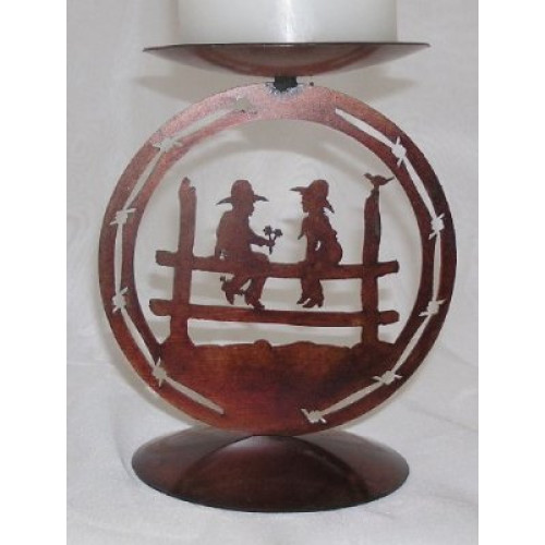 This medallion candle stand features a little cowboy with a fistful of flowers for his best girl, sitting beside him on a fence.