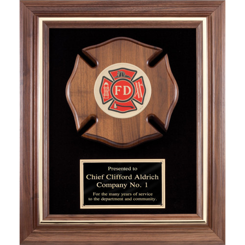 Genuine walnut frame with a Maltese Cross and firefighter symbol on black velour.